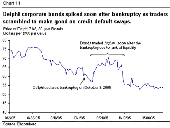 Improvement of the credit default settlement process is vital. Because of the growth in credit derivative contracts, market anomalies have occurred when corporations default or declare bankruptcy. A prime example is how corporate bonds of Delphi Corp. actually increased in value as traders bid up the price of bonds in order to physically settle credit derivative contracts. Industry participants are committed to implementing new procedures for settlements following a credit event, providing for net cash settlement at a single auction-based price.